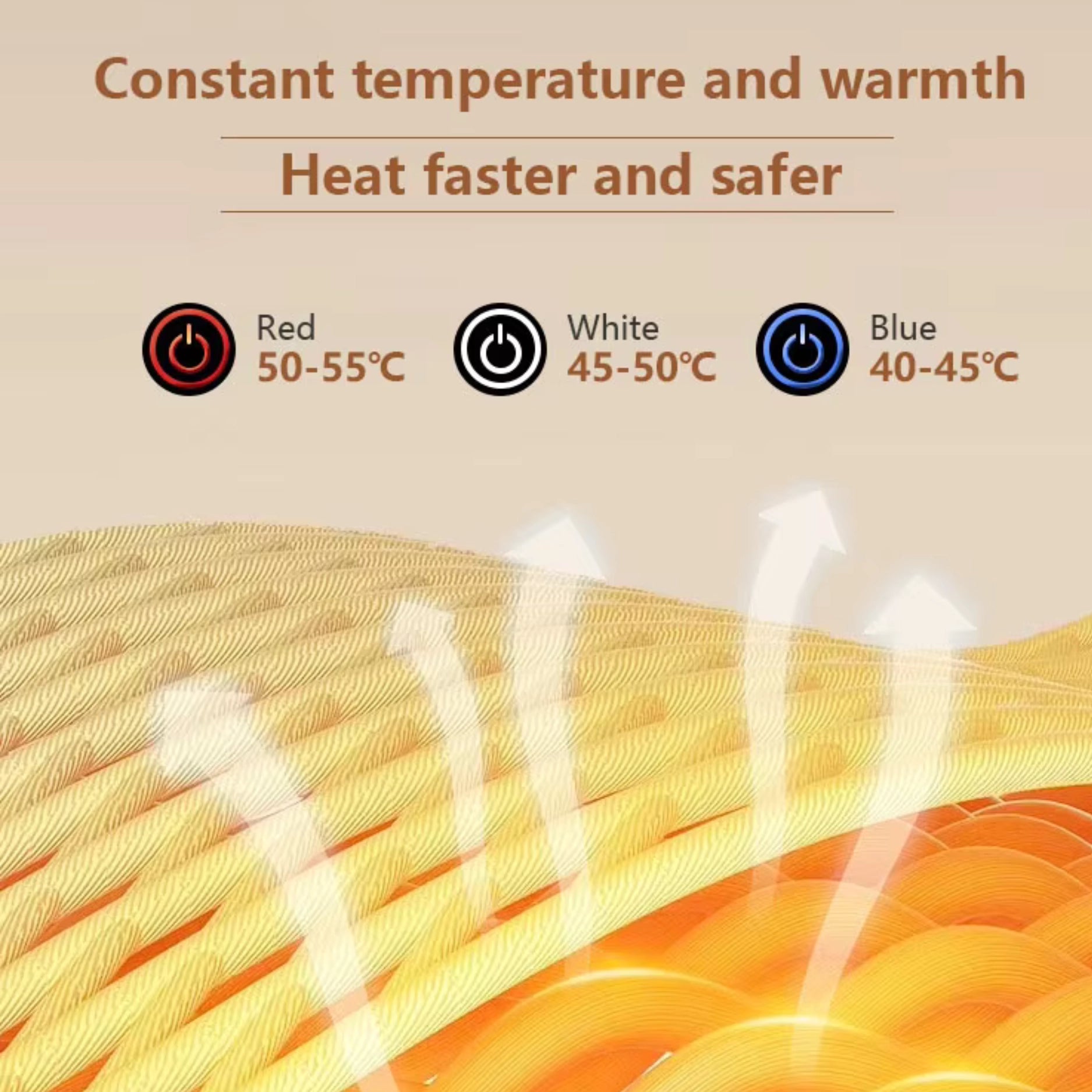 カーボンファイバーによる迅速加熱設計。約15秒で温まり、温風循環で冷気を効果的に遮断します。