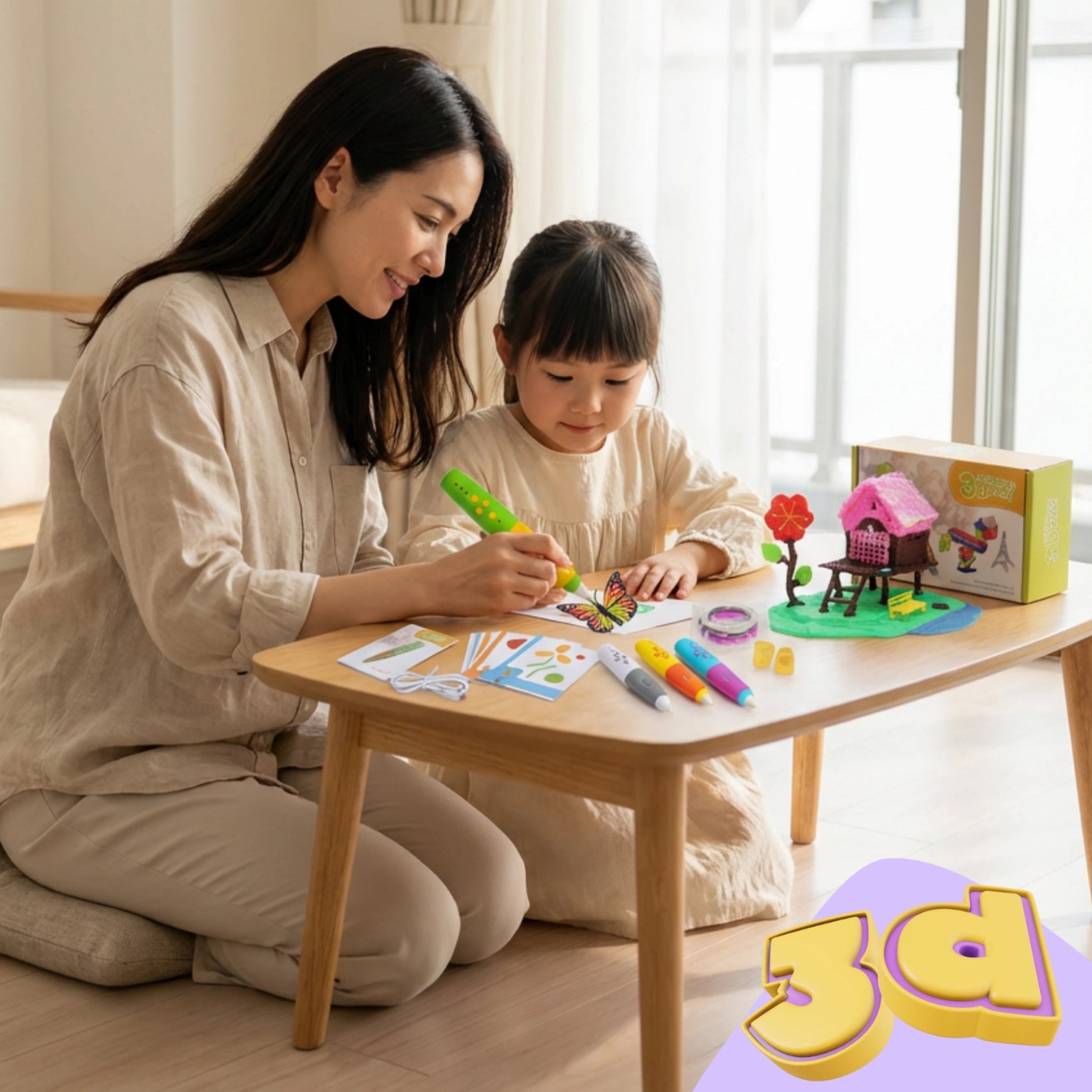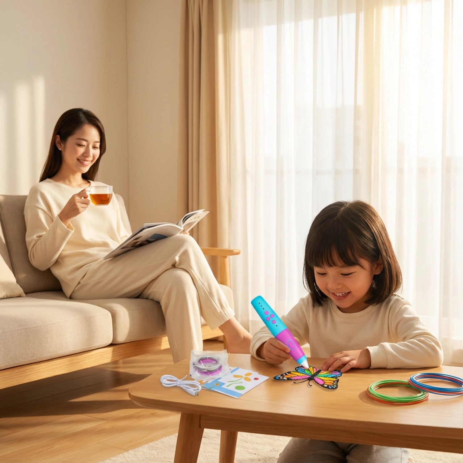 土曜日の午後3時。リビングで子どもが3Dペンを使っている。